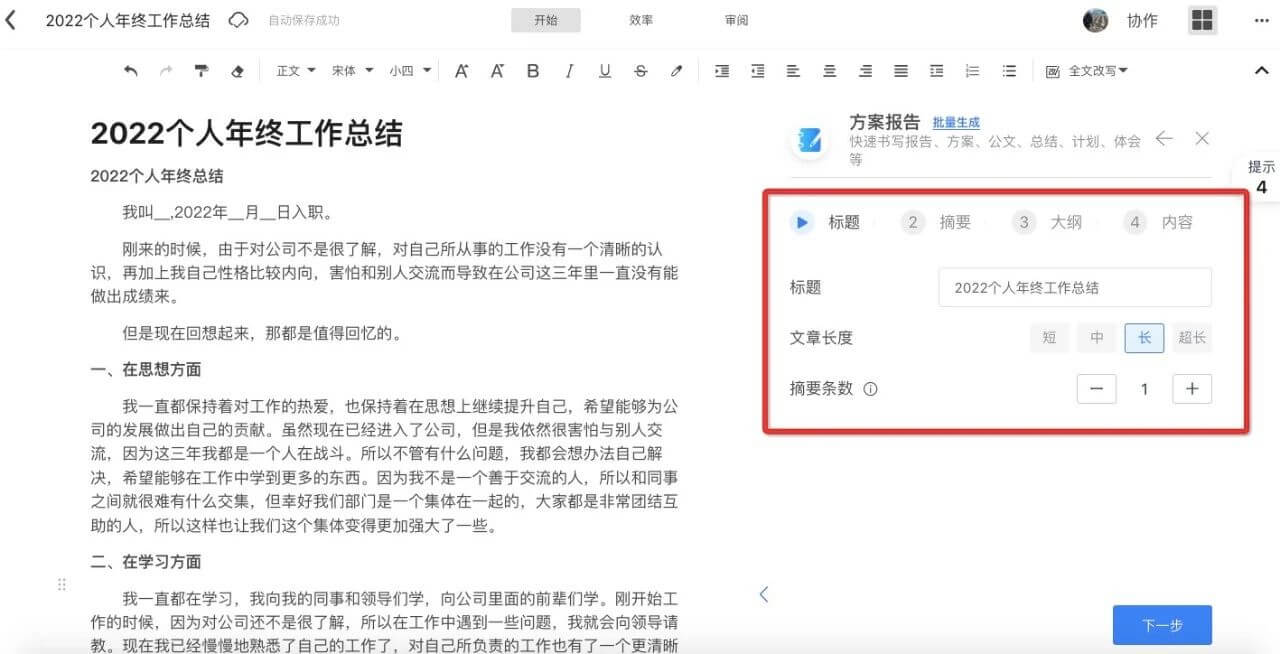我们打开写作猫使用方案报告写作模板,只需要写一个标题,几秒钟AI就会帮你写好篇几千字的年终总结!