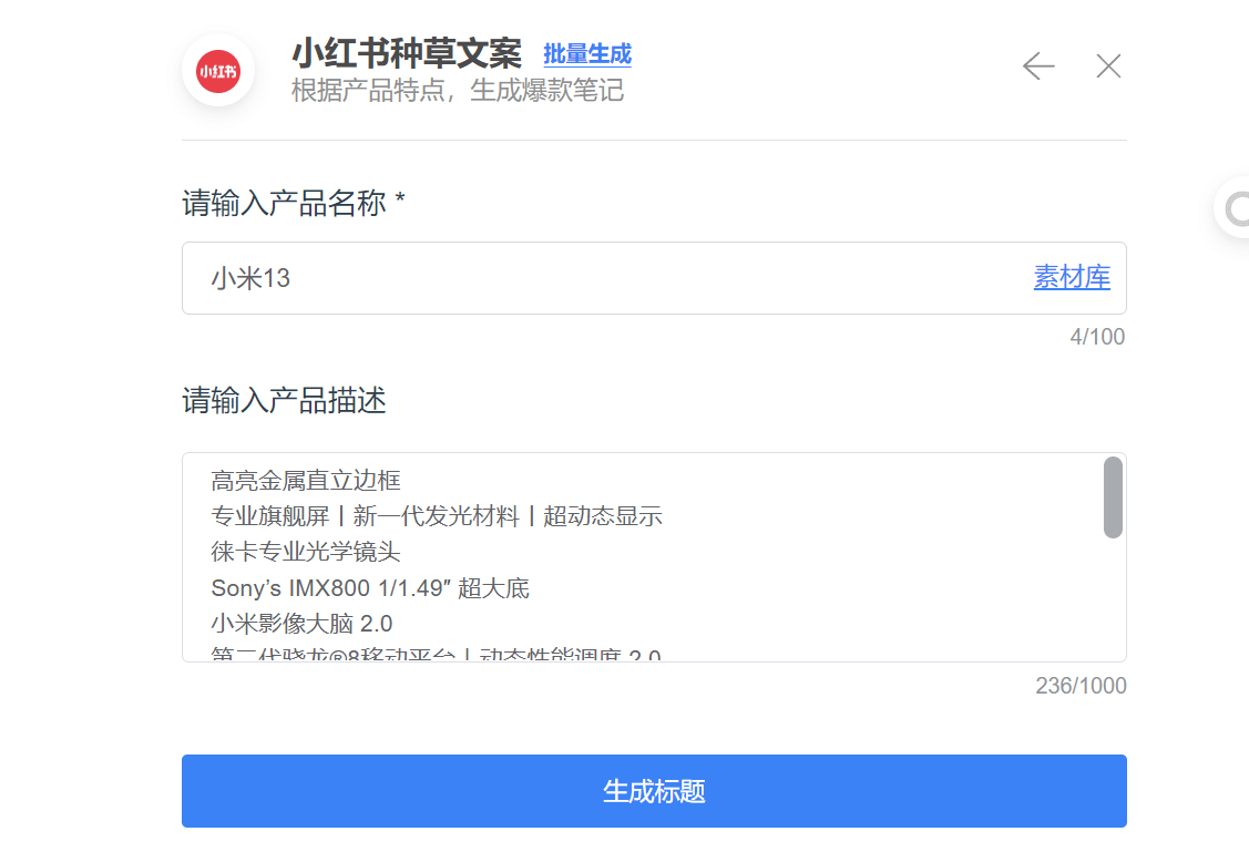 你只需要输入产品名称,然后输入产品的一些特点关键词!AI会自动为你生成不同方向种草文案。