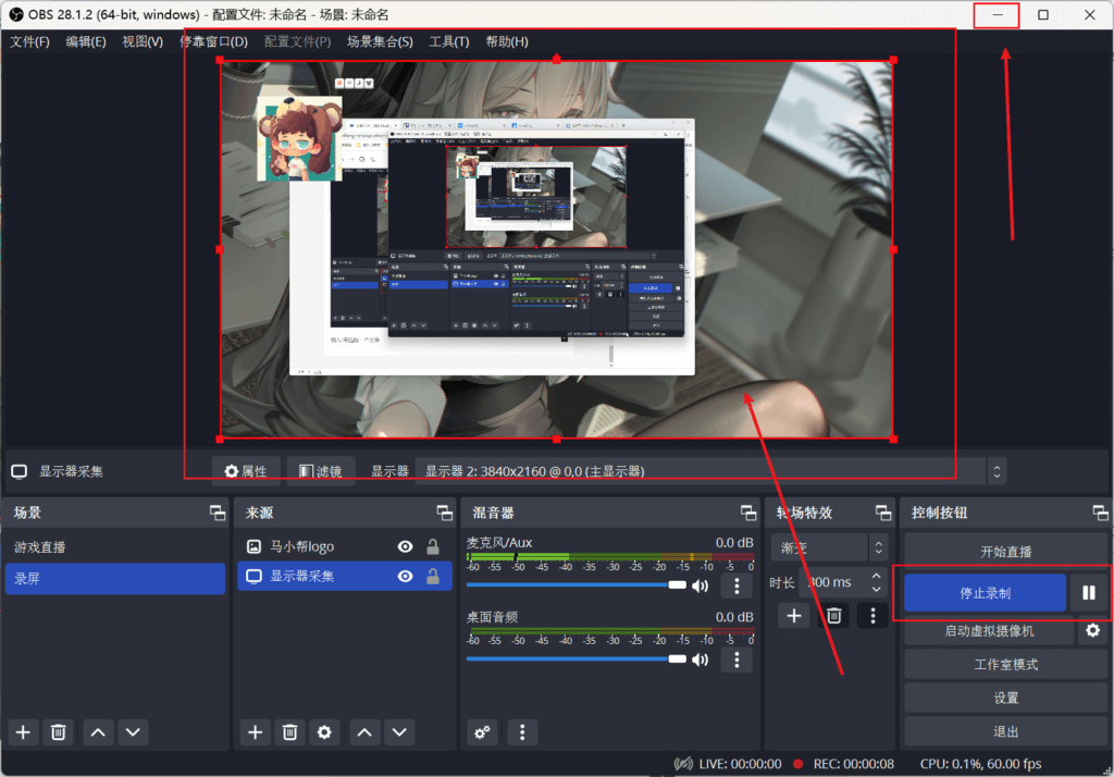 将你需要录制画面来源都设置好之后,点击开始录制,然后将OBS最小化即可。就这么简单!