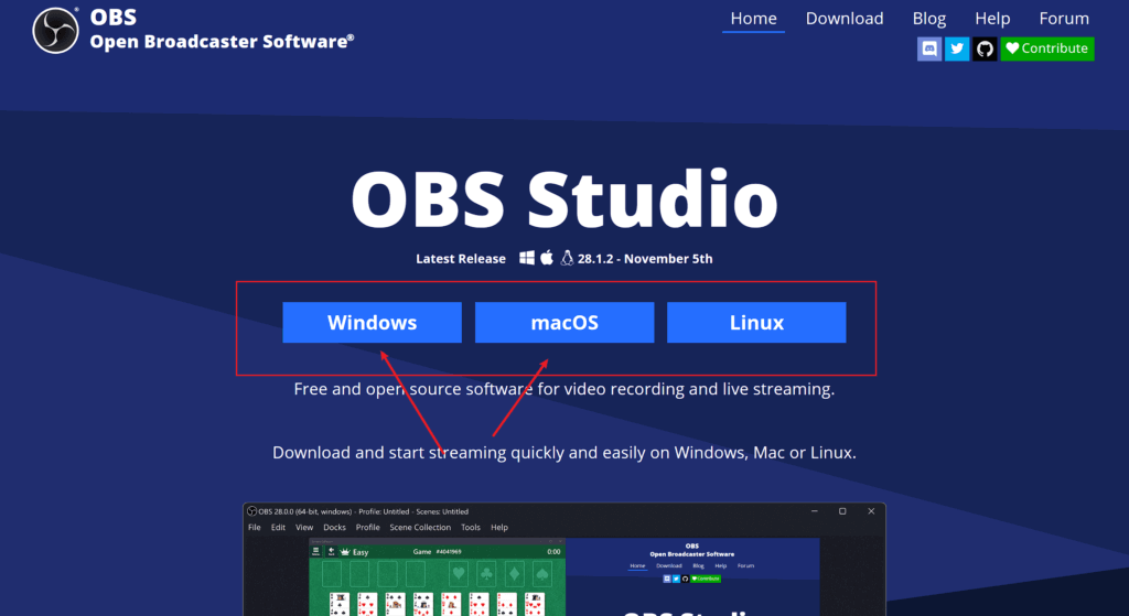 这是OBS的官网:https://obsproject.com/ ,首页可以看到三个非常显眼的下载按钮,支持Windows、macOS、linux 多个平台。点击即可自动下载(由于服务器在国外下载速度较慢,你也可以在文章末尾找到我为大家搬运的地址)