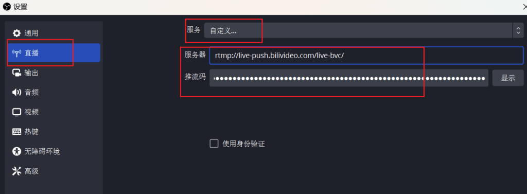 画面设置好之后,打开设置 — 直播 — 自定义 将你在某平台直播的服务器地址和推流码输入进去。