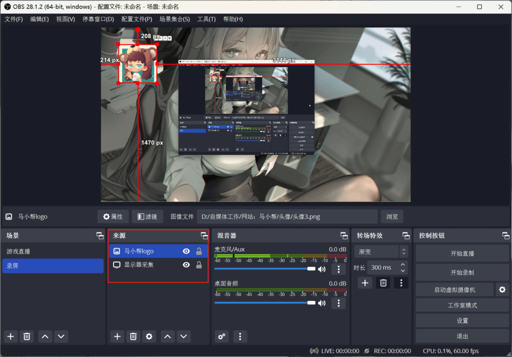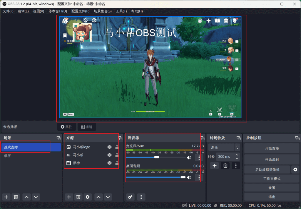 比如我这里要进行游戏直播,我就在来源中添加了一个游戏窗口,然后有增加了一个文字介绍和头像在画面中。这个画面就是观众可看到的画面。
