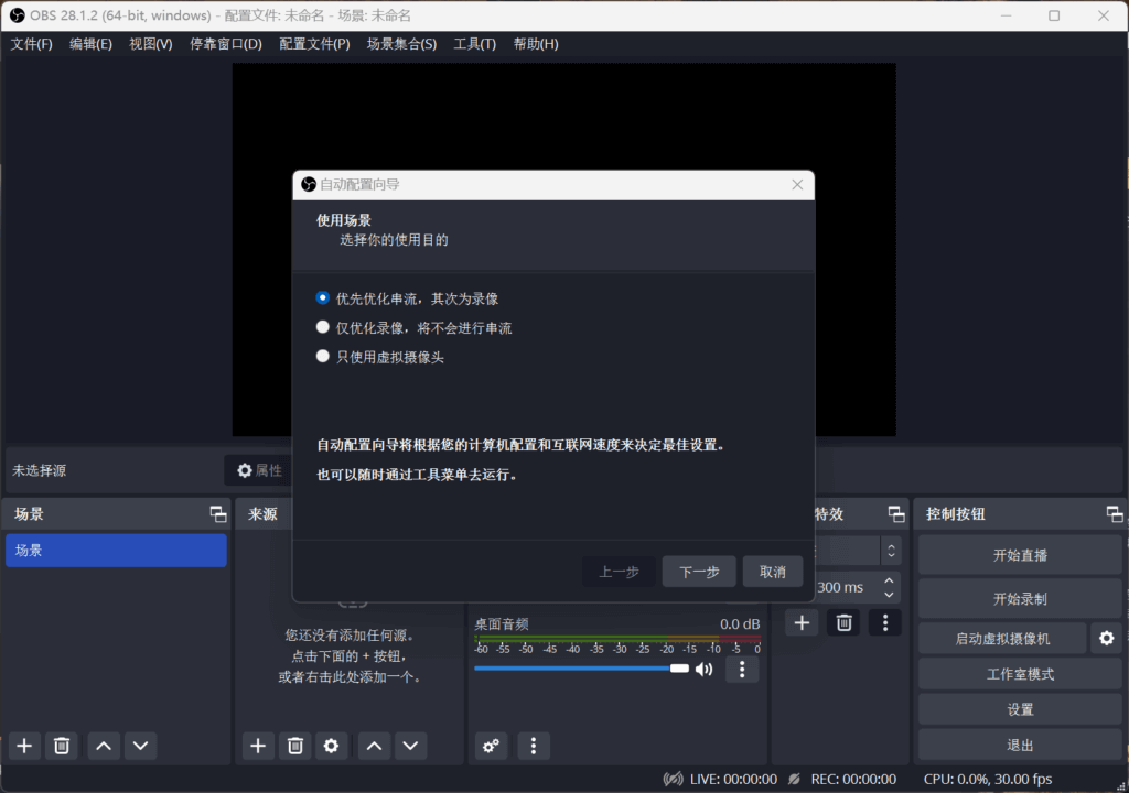 安装后首次打开是下面这样,会弹出首次配置的向导,你可根据你的需求一步一步来设置向导内容,也可以直接取消,然后继续看下面的基础设置教程。