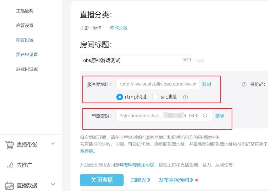 以B站为例,在网页版B站的开播设置中,进行开播,就会显示服务器地址和串流秘钥(推流码),复制它们填写到你的obs直播中即可。