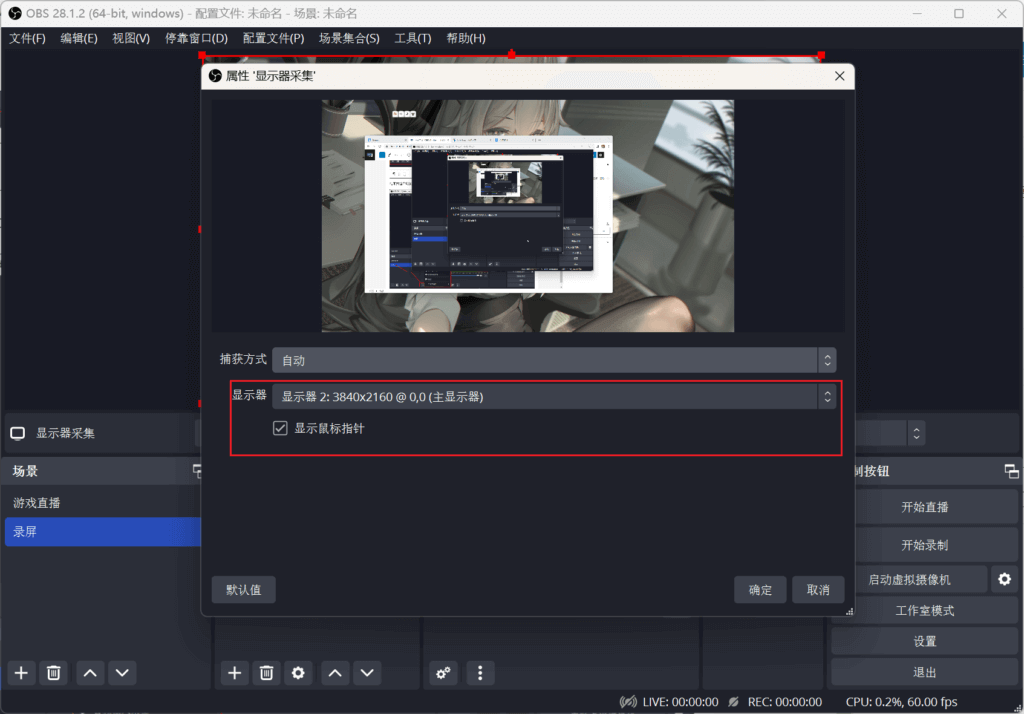 比如我这个场景就是用于整个显示器屏幕的录制,那我就在来源 里面新增显示器采集。这样整个显示器的画面就都会被我们录制。