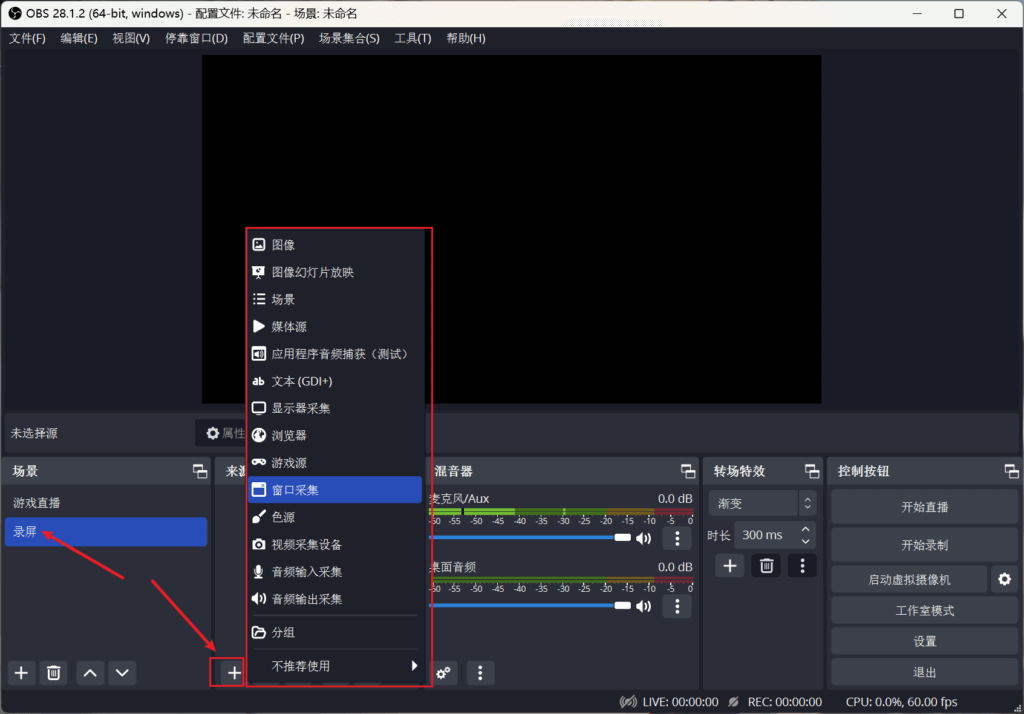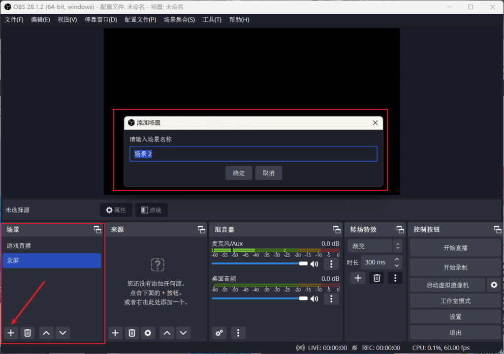 使用OBS直播同样需要新建一个场景,然后给这个场景添加你需要的画面内容。